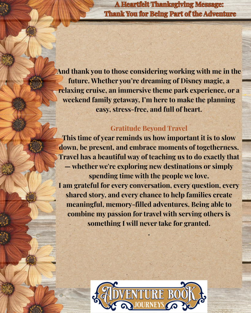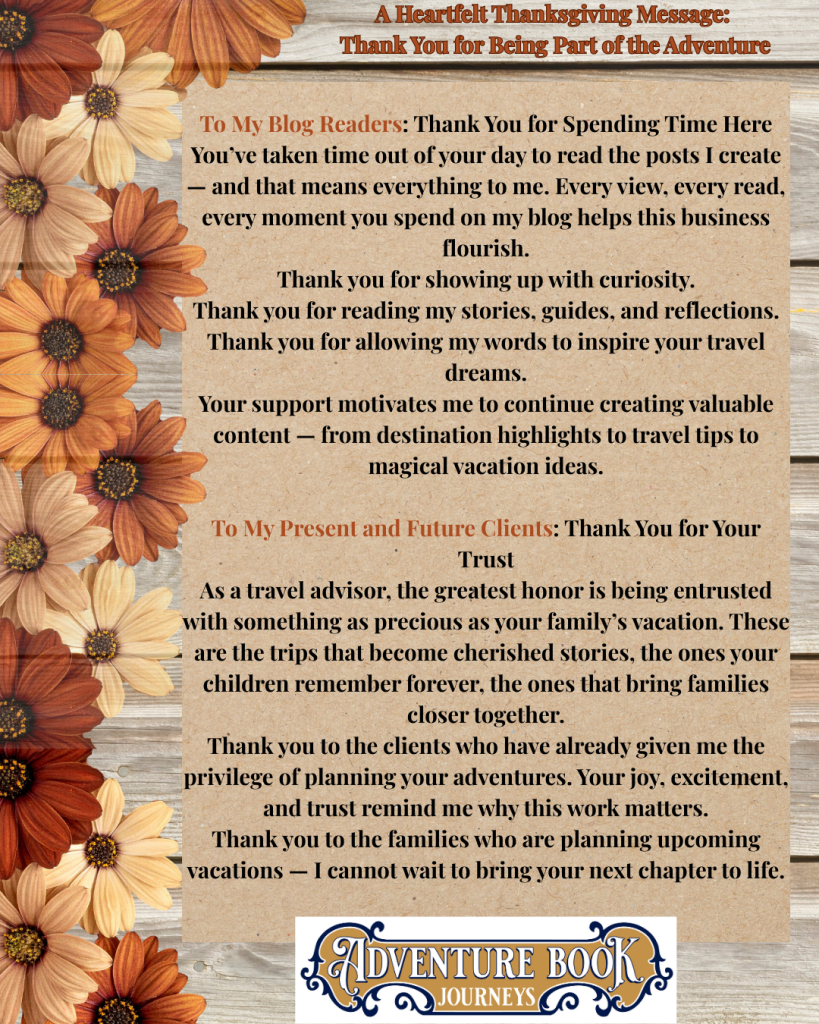 This Thanksgiving, I’m reflecting on the incredible people who make Adventure Book Journeys possible — from social media followers to blog readers to the families who trust me with their vacations. This season, I’m especially grateful for your support, your enthusiasm, and your belief in the magic of travel.