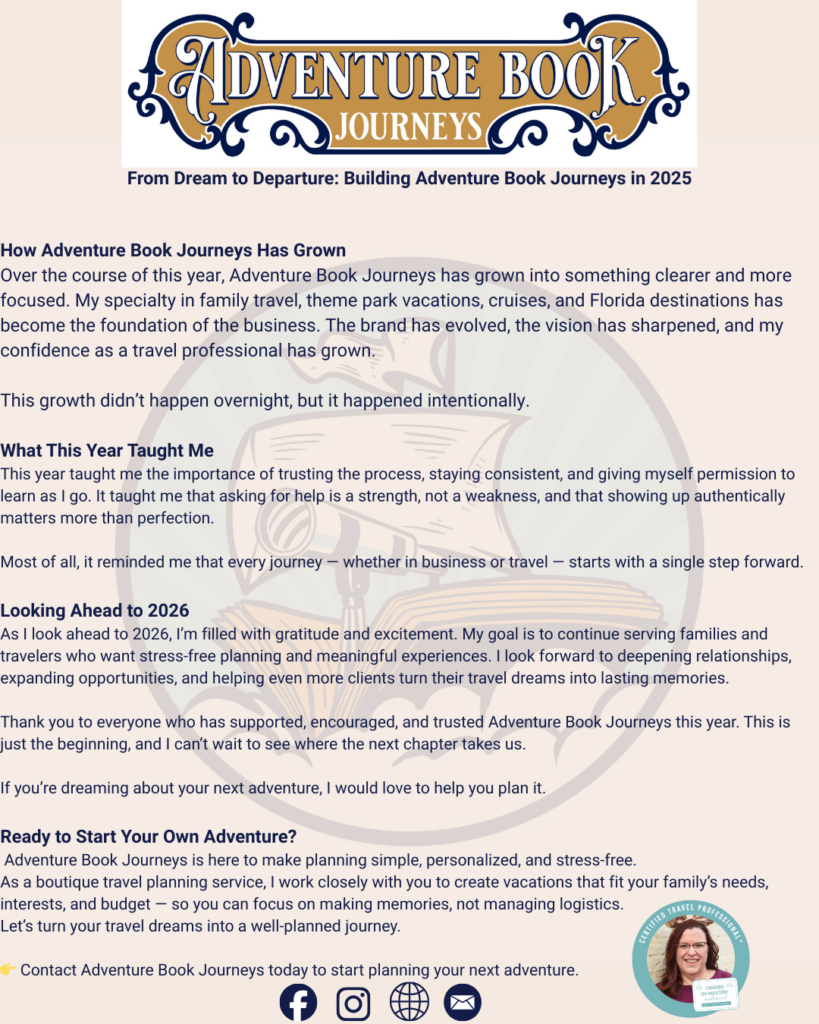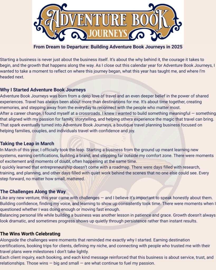 Starting a business is never just about the business itself. It’s about the why behind it, the courage it takes to begin, and the growth that happens along the way. As I close out this calendar year for Adventure Book Journeys, I wanted to take a moment to reflect on where this journey began, what…